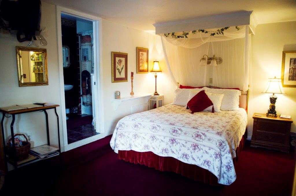 All rooms have private outside entrances. A french theme is fun in the poolside room with wall art by Gary Buffet The medium to large room has a half canopy queen size bed. An electric fired wood stove is in the room for that perfect ambiance without lugging logs. The private in room bath has Jacuzzi (whirlpool) tub with shower. A mini-kitchen unit with a 3/4 refrigerator, stainless steel sink, microwave, toaster & coffee pot for your private use. You can have your breakfast inside at your bistro table. or outside on your private deck.